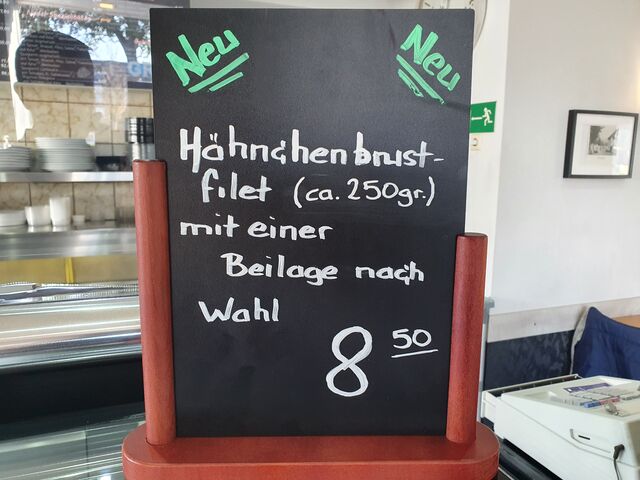 Hähnchenbrustfilet nach art des Hauses mit einer Beilage nach Wunsch.